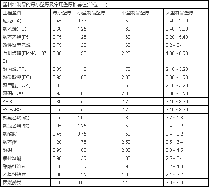 塑膠制品的最小壁厚及常見壁厚推薦值見下表: