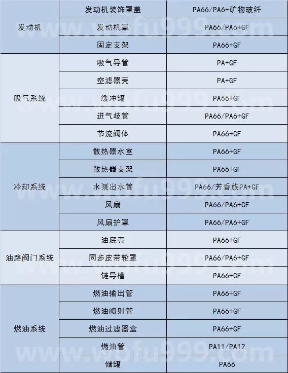 從中看出,經(jīng)過改性的PA材料在性能上會(huì)適應(yīng)很多汽車零部件的需求,一般填充、增強(qiáng)改性用的最多,另外在EPDM和POE增韌改性也有了很大市場(chǎng),還有就是隨著汽車產(chǎn)業(yè)零部件的更新迭代,新能源汽車的發(fā)展在新能源電池及充電樁等的應(yīng)用,改性PA時(shí)對(duì)流動(dòng)性,耐熱性及無鹵阻燃等性能都有很強(qiáng)烈的需求。